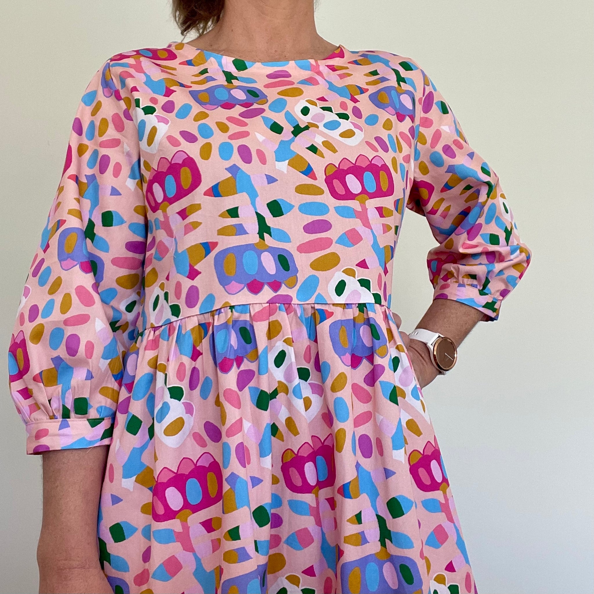 Long sleeved, tiered dress with pockets.