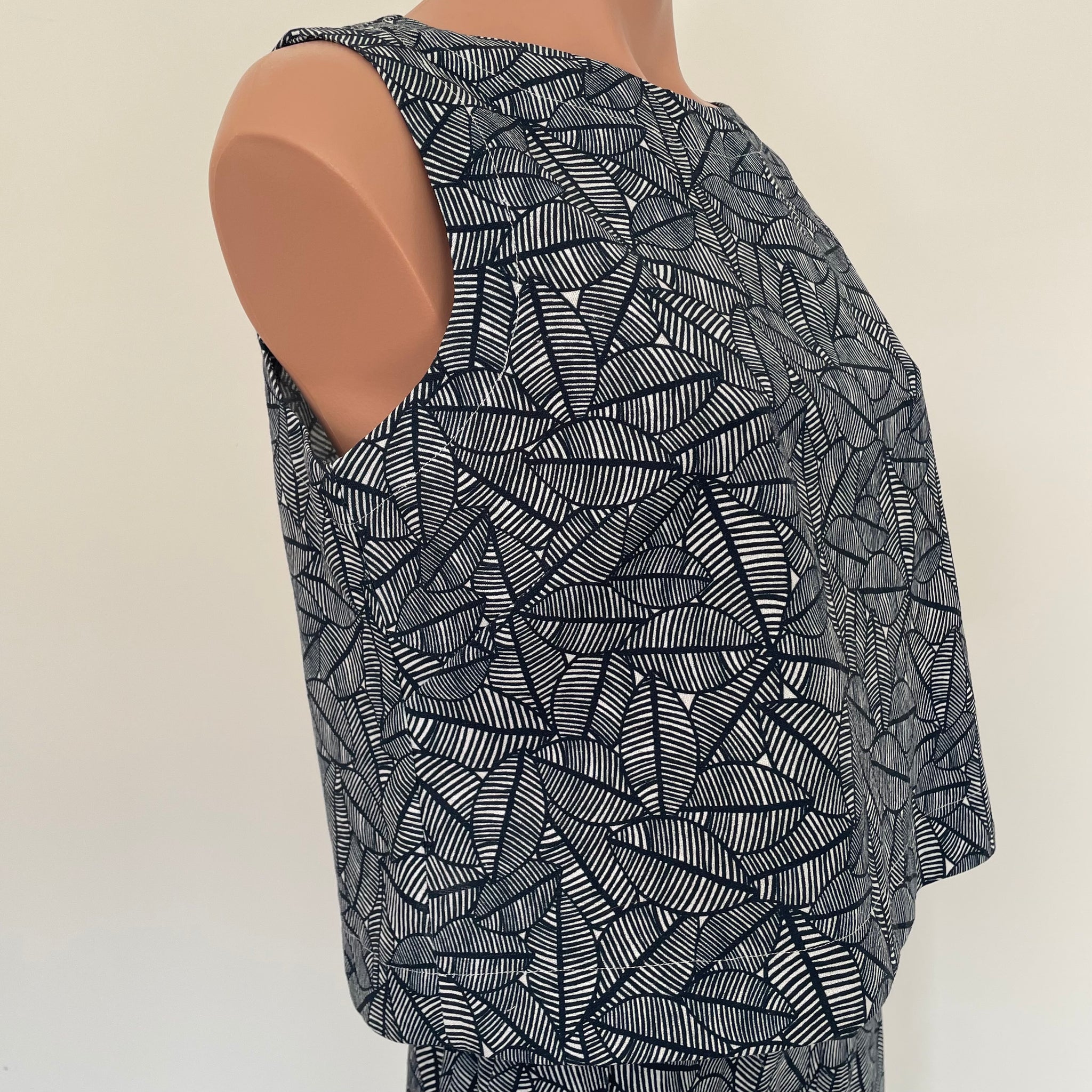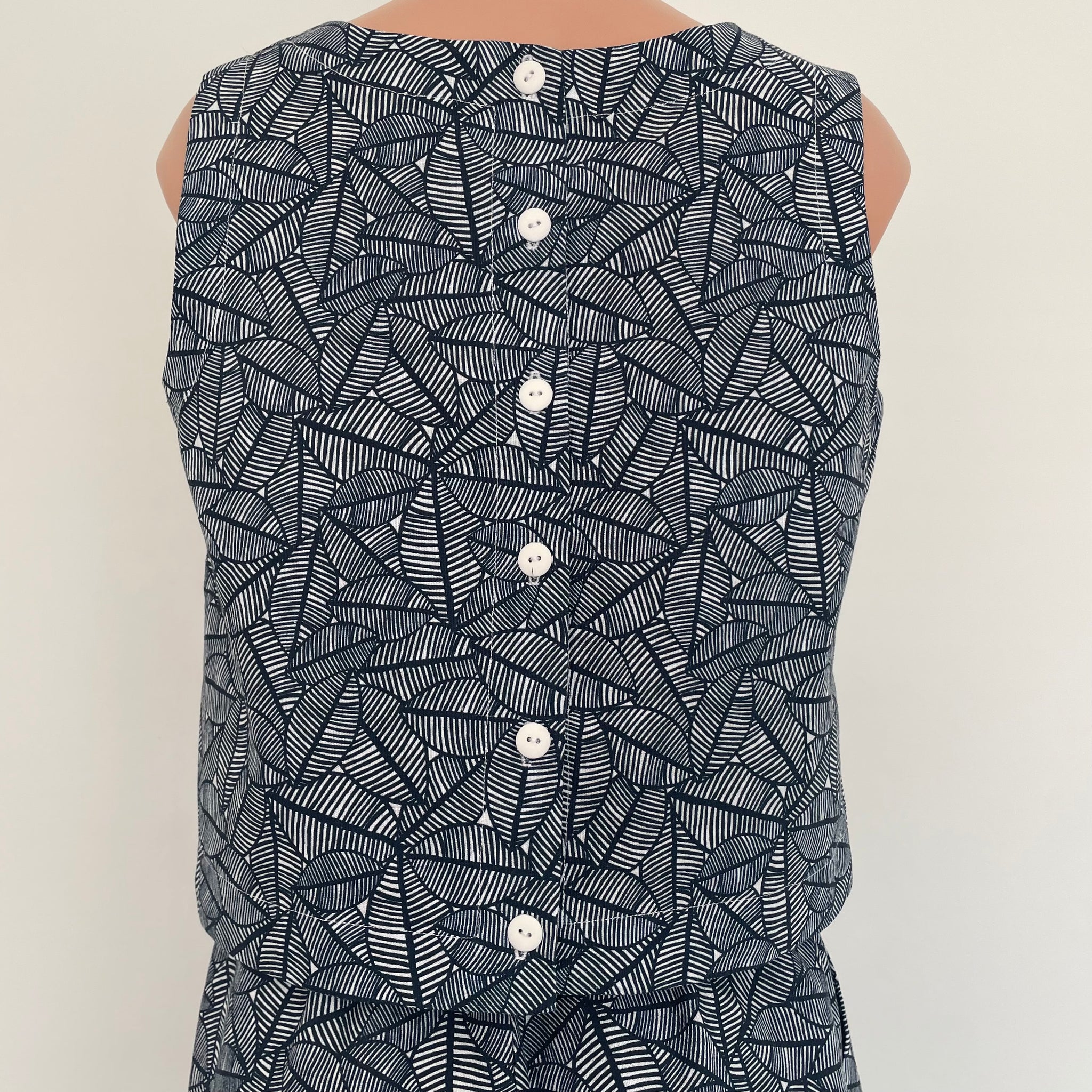 Sleeveless box shaped top with button up back.